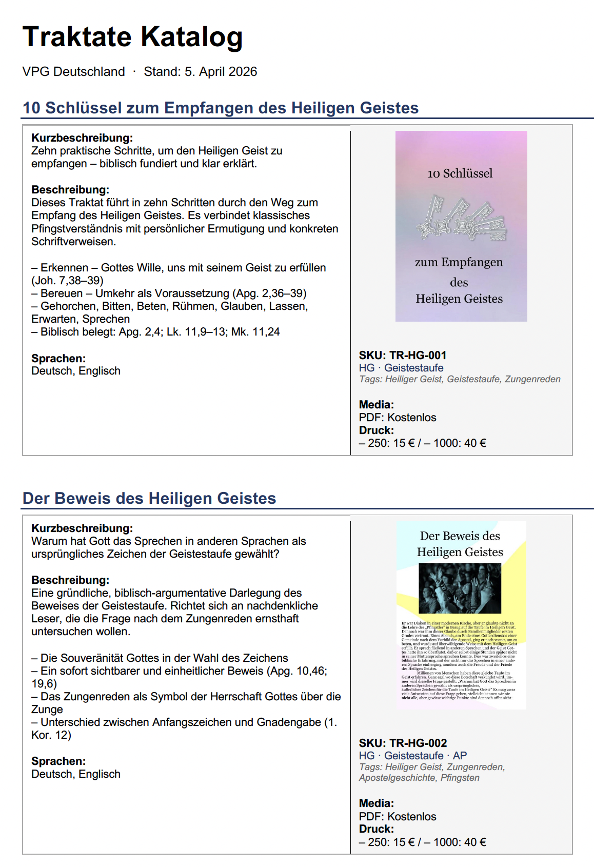 Wir haben mehrere Traktate von verschiedenen Arten entwickelt. Die Meisten sind in A6 Hochformat (105 x 148mm) gefaltet in unterschiedlichen Seitenzahlen. Es gibt auch andere Formate sowie gefaltetes Visitenkartenformat und DIN Lang.